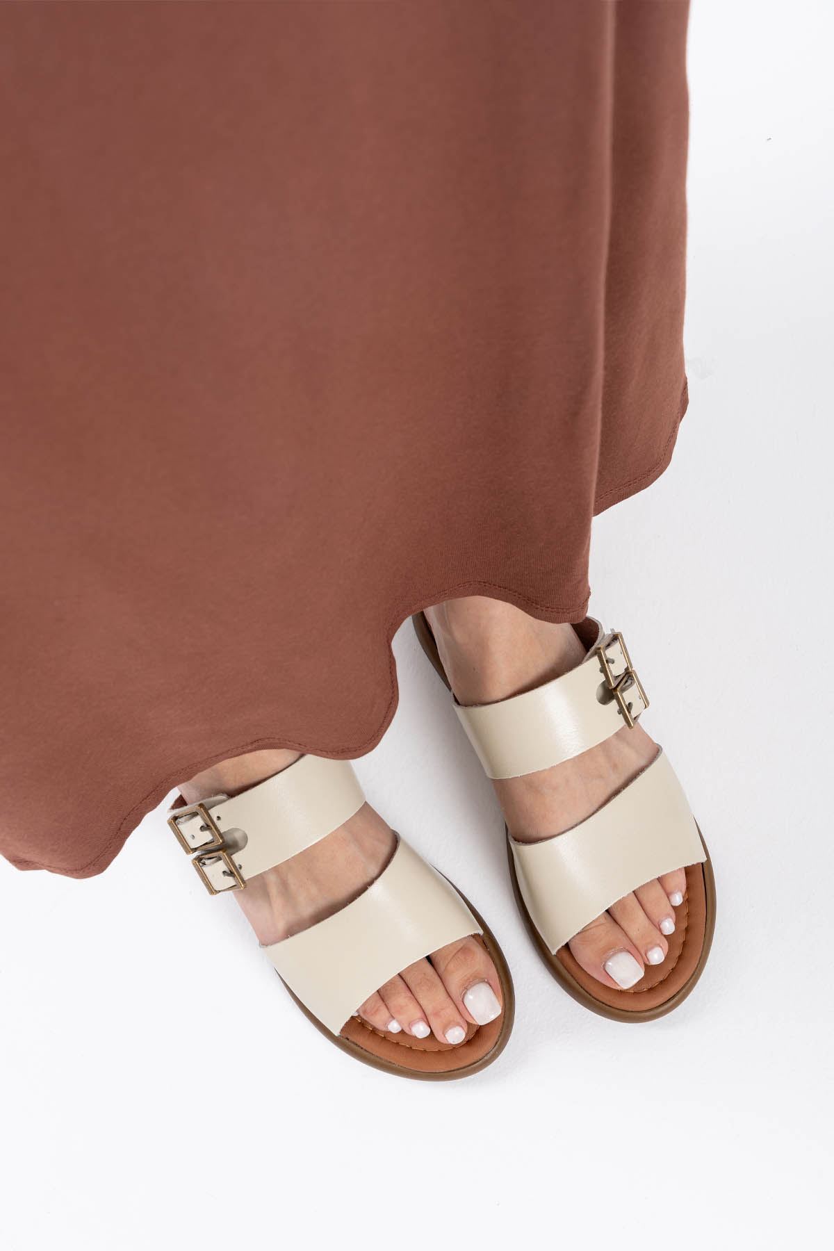 Minimal çizgilerle sade şıklığı birleştiren bu terlik, yaz aylarında özgürlüğün en zarif halini sunuyor. Hakiki derinin doğal dokusu, konforlu iç tabanla buluşarak gün boyu yumuşak bir deneyim vadediyor. Altın tokalı detaylar, sade tasarıma sofistike bir vurgu katarak her kombini zarifçe tamamlıyor. İster tatilde, ister şehirde; kendinizi şımartın. Ripuvainen, konforu estetikle harmanlıyor.