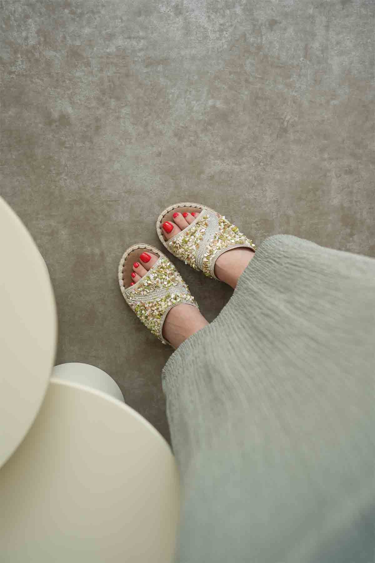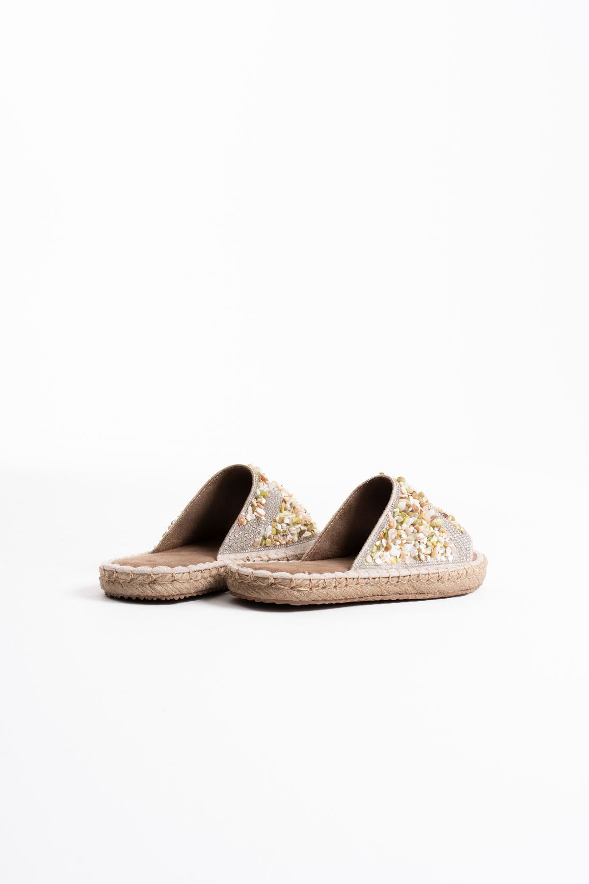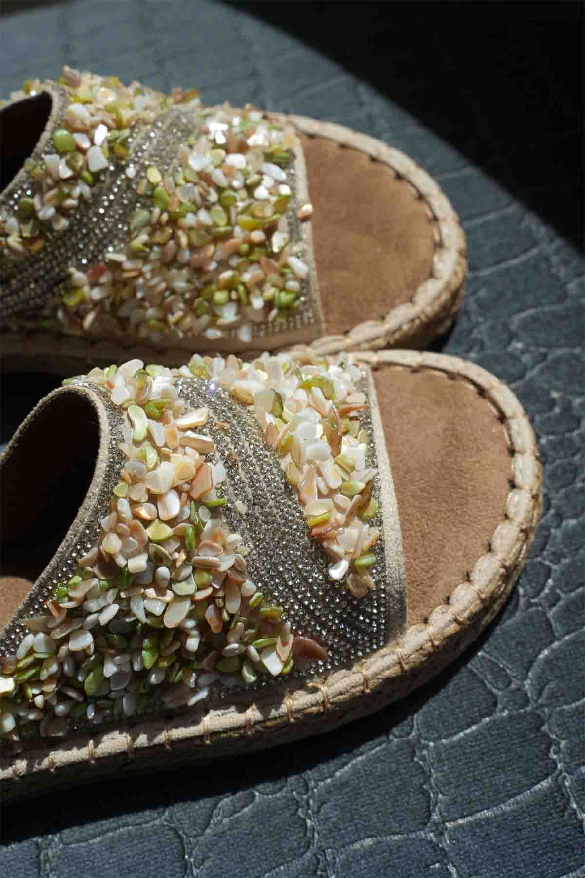 El işçiliğini andıran taş süslemeler ve natürel taban tasarımıyla bu terlik, yaz aylarında hem rahatlığın hem de göz alıcılığın simgesi.